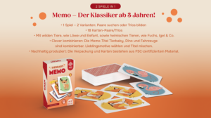 Die Karten und die Verpackung sind in einem handlichen kleinen Format, sodass der Memo-Spaß überall hin mitgenommen werden kann. Alle Spiele sind nachhaltig produziert, damit Spielspaß und Umweltbewusstsein Hand in Hand gehen.