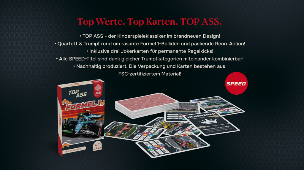 In diesem TOP ASS rund um rasante Formel 1-Bolliden und packende Renn-Action heißt es: Trumpfen, Sammeln, Siegen! Quartett & Trumpf: zwei Klassiker, ein Spiel! Drei Jokerkarten für mehr Spannung enthalten! Technische Kategorien sind bei allen SPEED-Titeln identisch und dadurch miteinander kombinierbar!