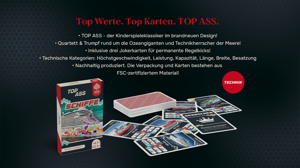 In diesem TOP ASS rund um die Ozeangiganten und Technikherrscher der Meere heißt es: Trumpfen, Sammeln, Siegen! Quartett & Trumpf: zwei Klassiker, ein Spiel! Drei Jokerkarten für mehr Spannung enthalten!